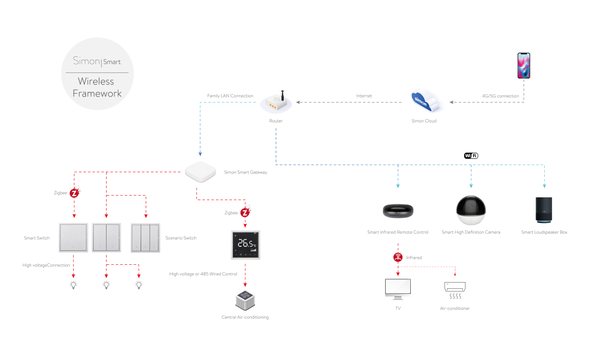 Simon Smart bao gồm các dòng sản phẩm tích hợp vào hệ thống điều khiển thông minh toàn diện cho một ngôi nhà. Thay vì sử dụng các công tắc ổ cắm, điều khiển truyền thống thì Công tắc Smart của Simon mang đến cho bạn trải nghiệm mượt mà, mới mẻ.